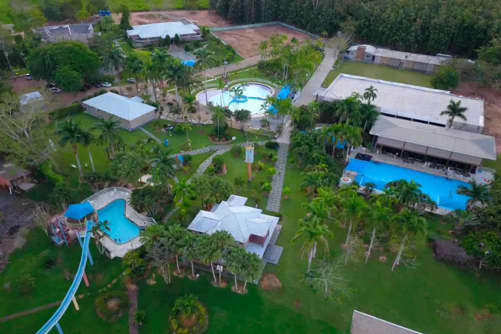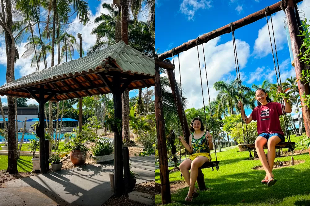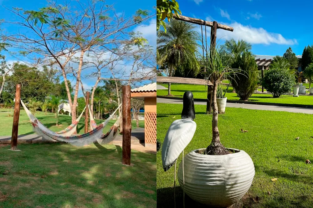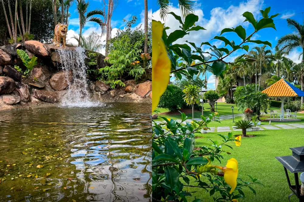 Um dos maiores atrativos do hotel é sua extensa área verde. São jardins arborizados, cuidadosamente planejados para quem busca relaxar e respirar ar puro. O espaço conta com um lago natural, uma bela cascata, e uma charmosa área com redário, perfeita para descansar à sombra das árvores. Há ainda quiosques com churrasqueira, ideais para piqueniques e encontros em família, tudo isso rodeado por paisagens naturais que proporcionam tranquilidade e bem-estar.