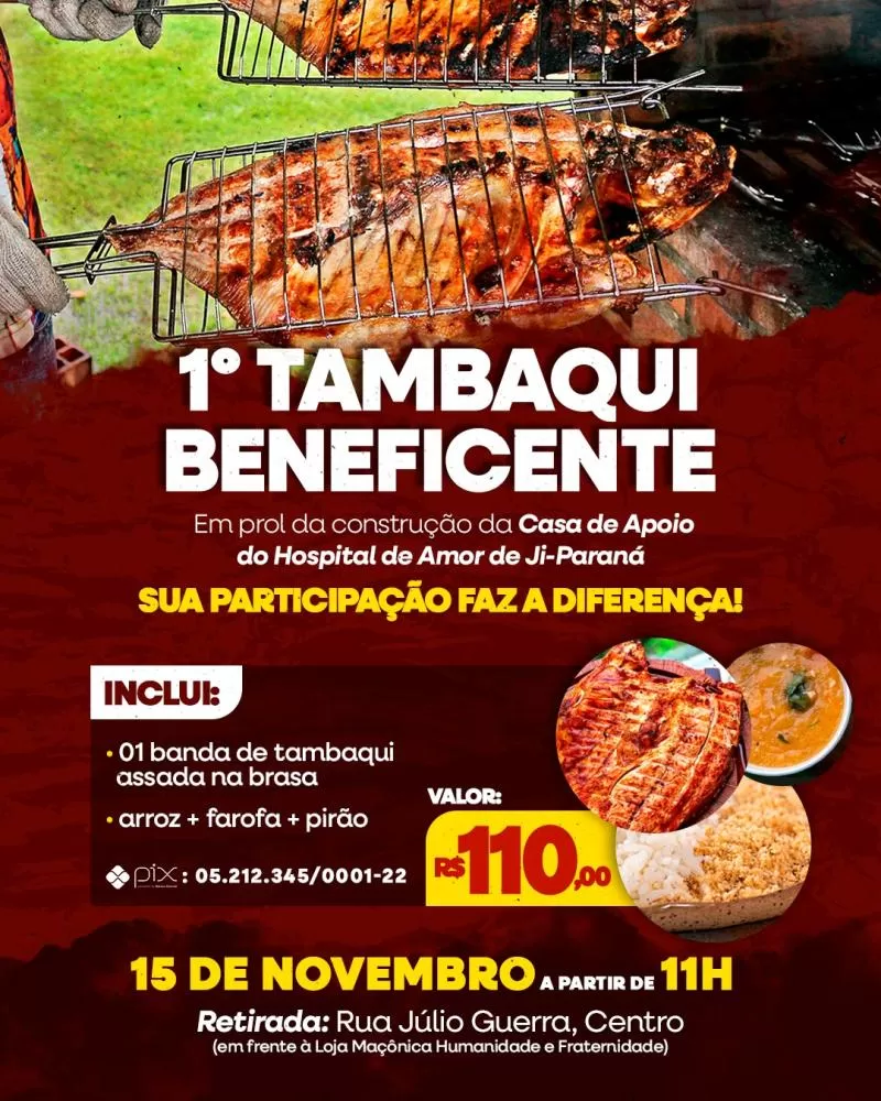 No dia 15 de novembro (sábado), a partir das 11h, acontece o 1º Tambaqui Beneficente em Ji-Paraná. O evento será realizado na Rua Júlio Guerra, no Centro, em frente à Loja Maçônica Humanidade e Fraternidade, e tem como objetivo arrecadar recursos para a construção da Casa de Apoio do Centro de Prevenção do Hospital de Amor de Ji-Paraná.